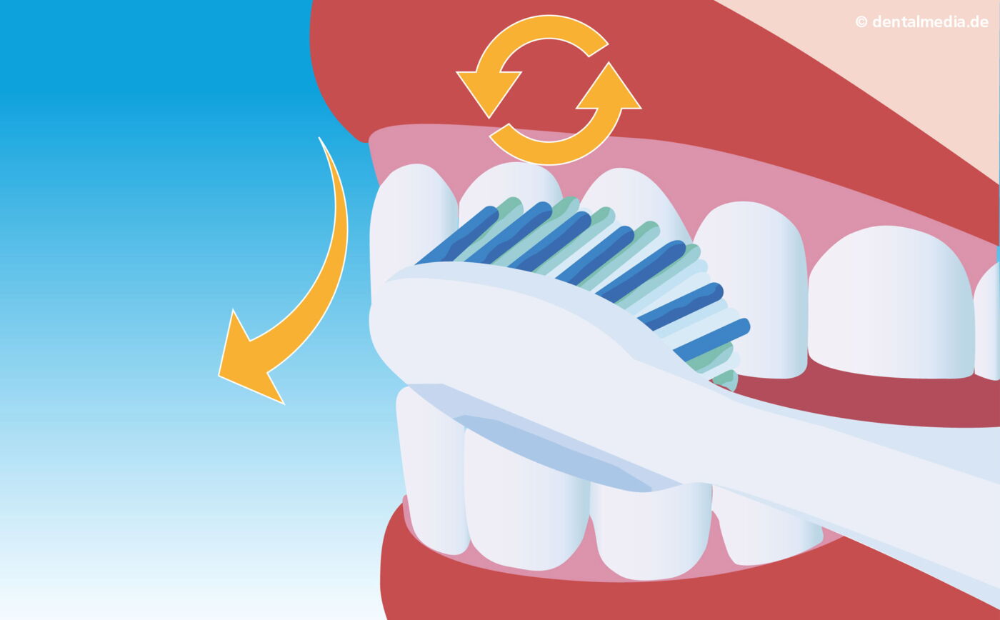 Als letztes werden die Innenflächen mit kleinen Kreisen oder Drehbewegungen „von Rot nach Weiß“, das heißt vom Zahnfleisch zum Zahn gereinigt.